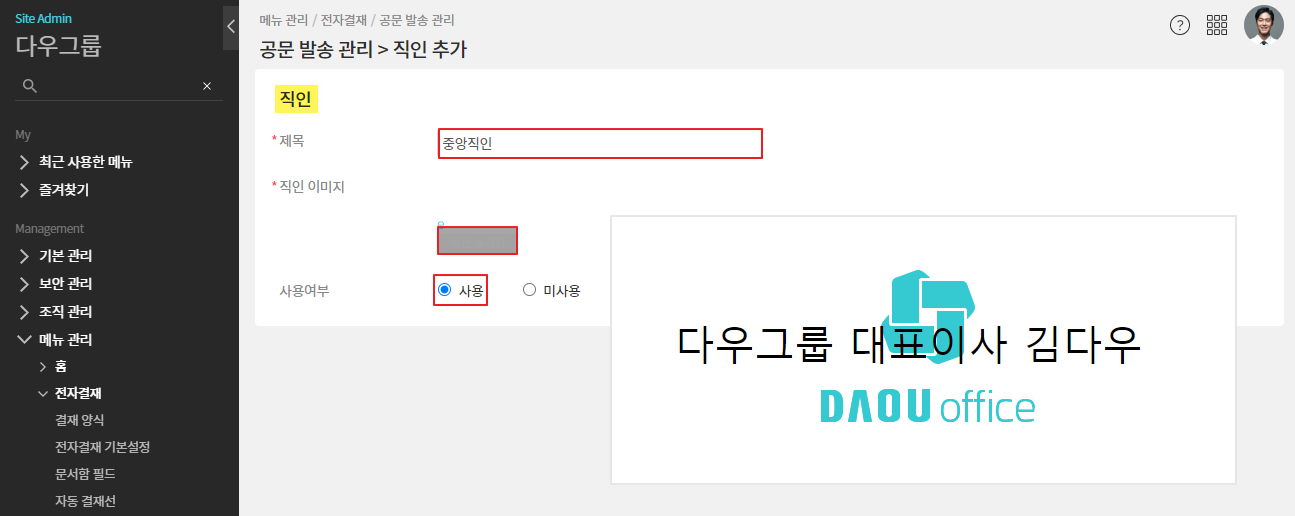 ③ 직인 이미지 업로드 ▷ 제목 입력 ▷ 사용 체크 ▷ 저장