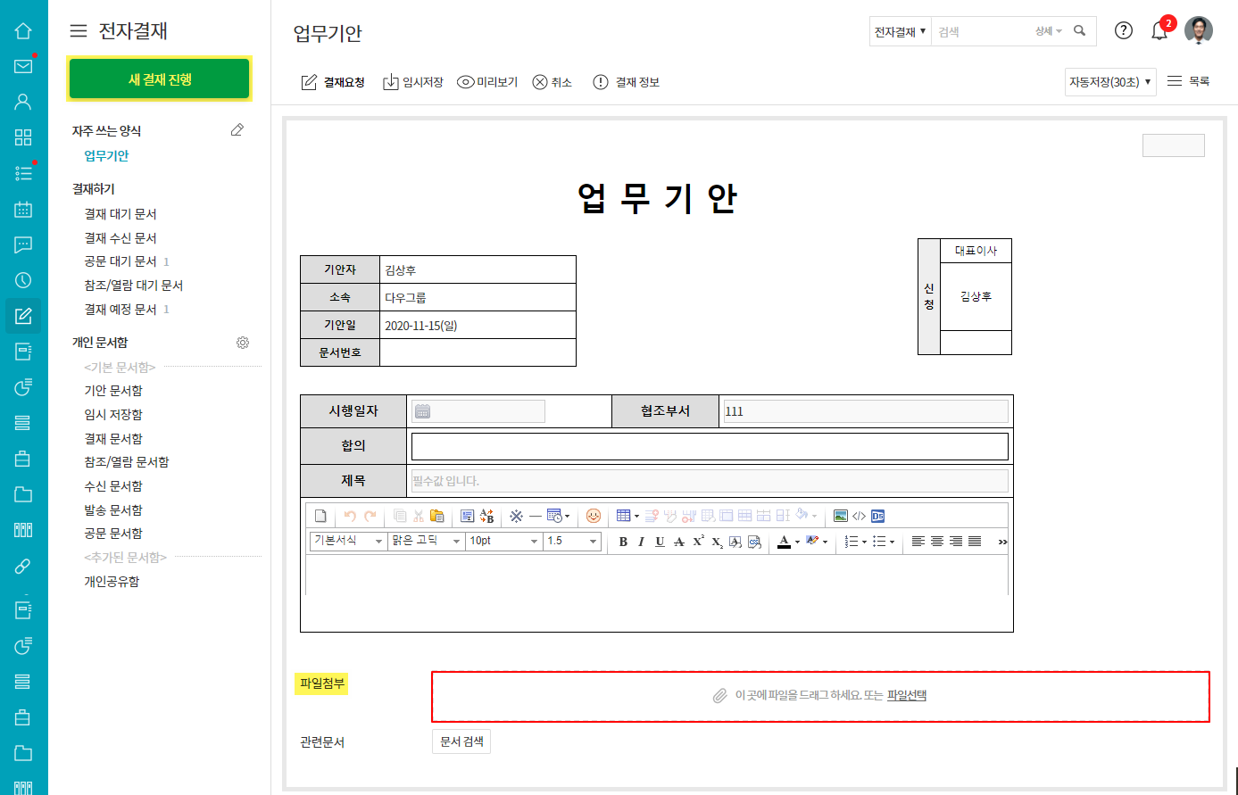 [새 결재 진행] 버튼 클릭 후 기안 화면 하단의 파일첨부 부분을 통해 첨부 가능합니다.