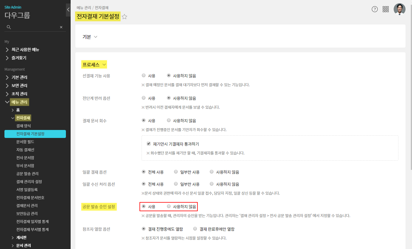 - 관리자페이지(SiteAdmin) ▶ 메뉴 관리 ▶ 전자결재 ▶ 전자결재 기본설정 ▶ 프로세스 ▶ 공문 발송 승인 설정