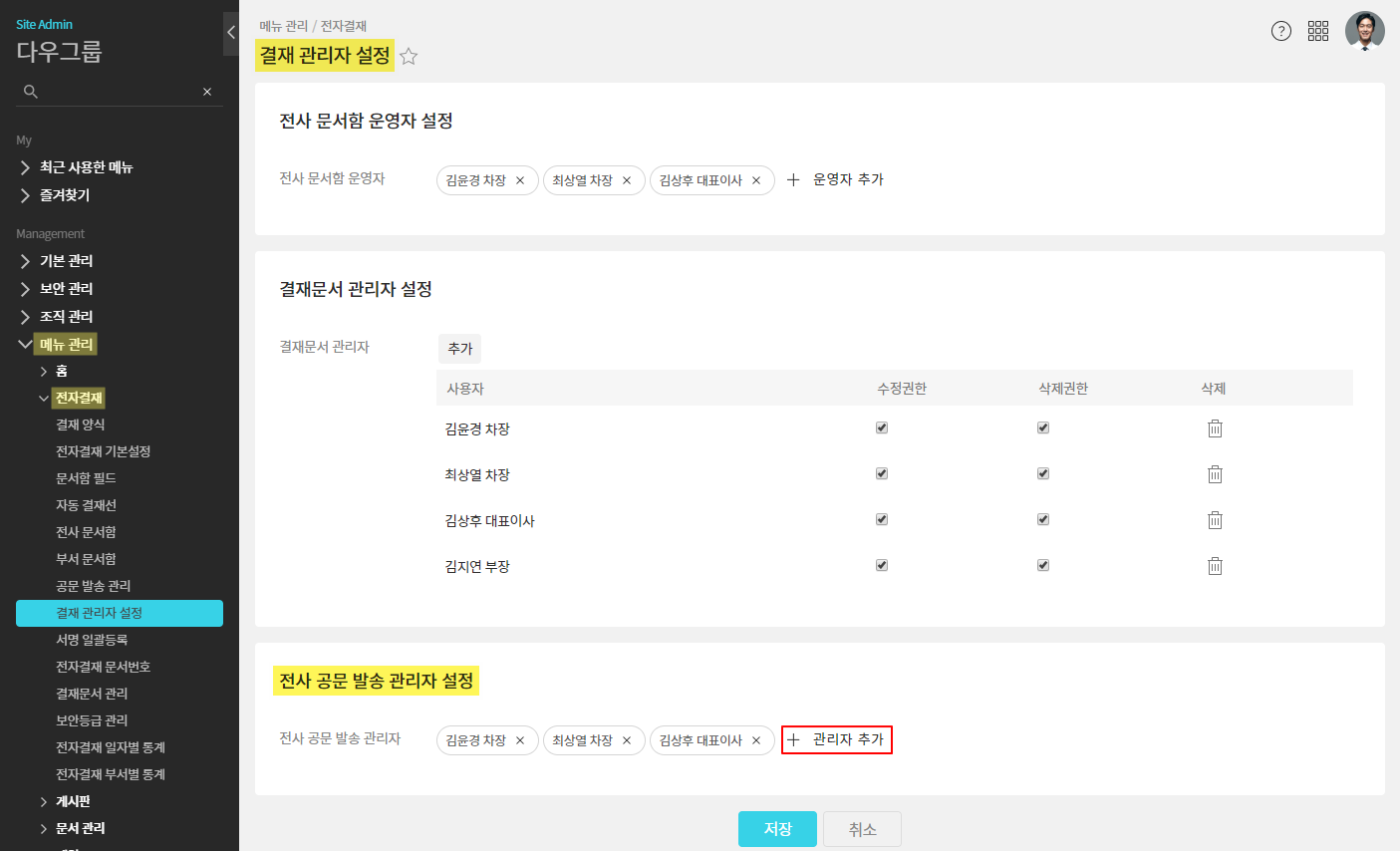 - 관리자페이지(SiteAdmin) ▶ 메뉴 관리 ▶ 전자결재 ▶ 결재 관리자 설정 ▶ 전사 공문 발송 관리자 설정 ▷ + 관리자 추가