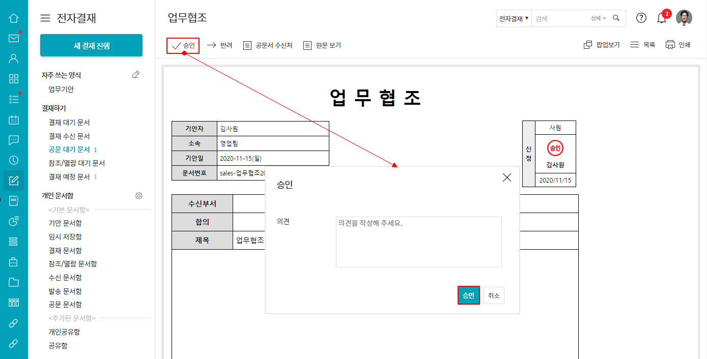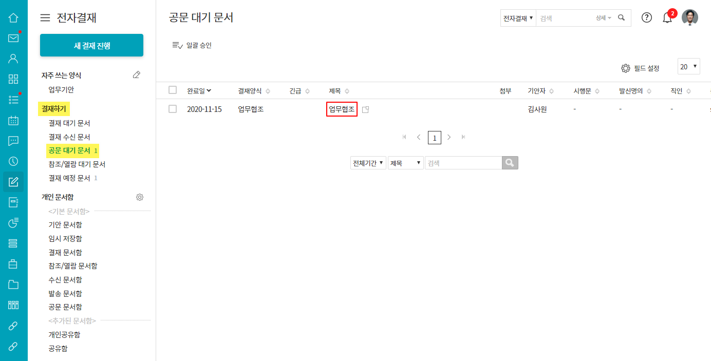 ① 전자결재 ▶ 결재하기 ▶ 공문 대기 문서 ▶ 문서 선택