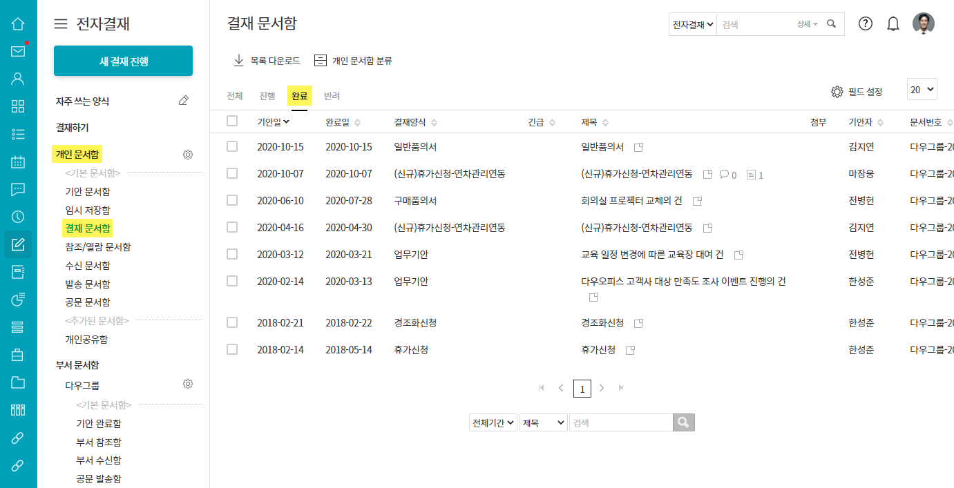 - 전자결재 ▶ 결재 문서함 ▶ [완료] 탭 클릭