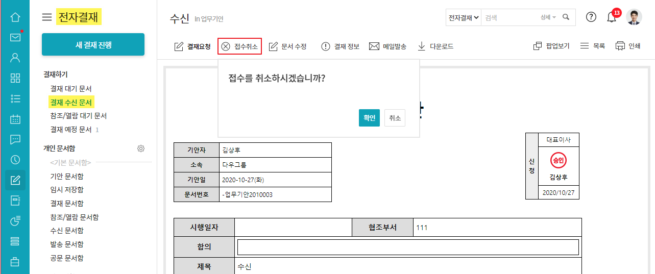 - 전자결재 ▶ 결재 수신 문서 ▶ 문서 클릭 ▷ 접수취소 ▷ 확인