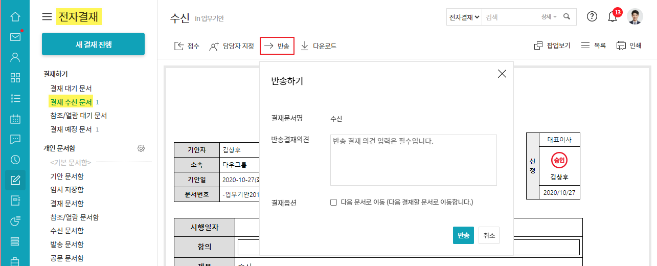 - 전자결재 ▶ 결재 수신 문서 ▶ 문서 클릭 ▷ 반송 ▷ 반송