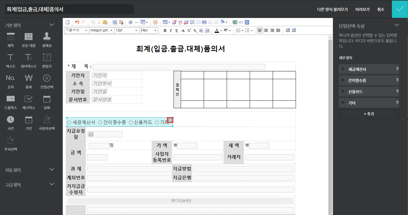 - 단일선택 : 하나의 옵션만 선택할 수 있는 입력항목입니다. 라디오 버튼으로도 불립니다.