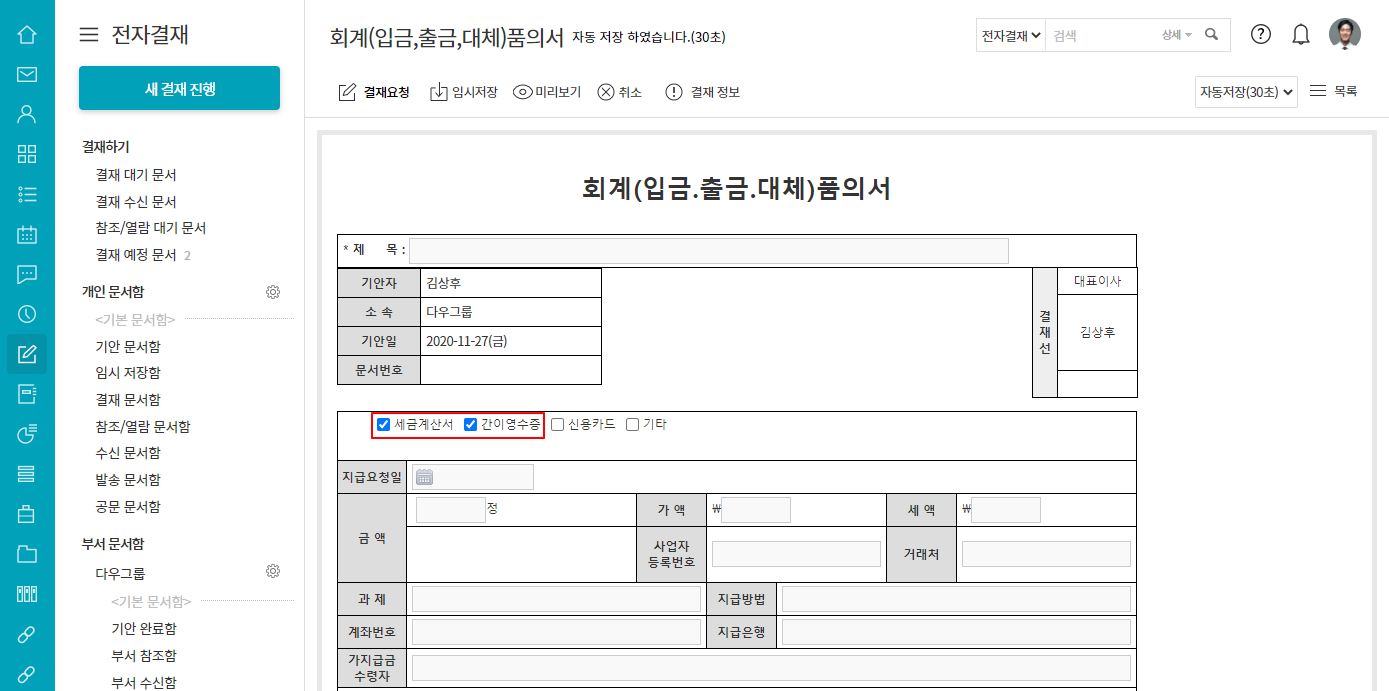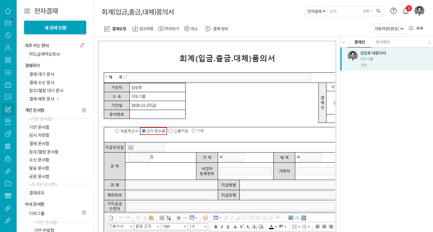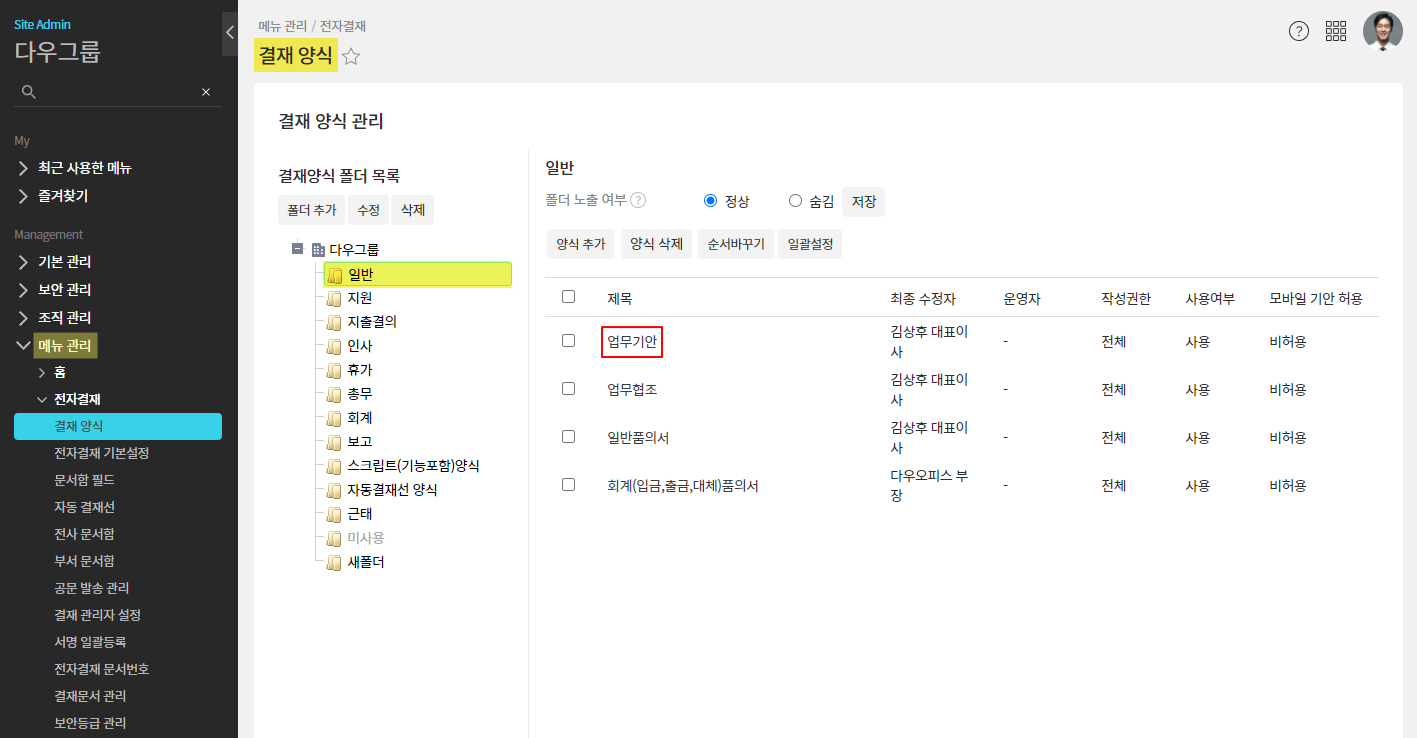 ① 관리자페이지(SiteAdmin) ▶ 메뉴 관리 ▶ 결재 양식 ▶ 폴더 선택 ▷ 양식 선택