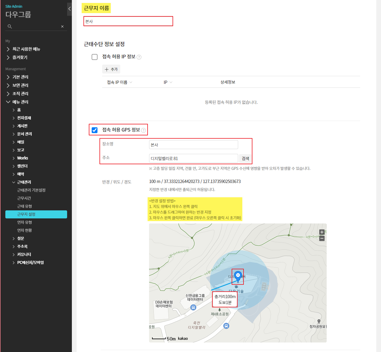 관리자 권한으로 근무그룹 별 [근태 근무지]를 설정하여 근태 GPS 범위를 설정할 수 있습니다.