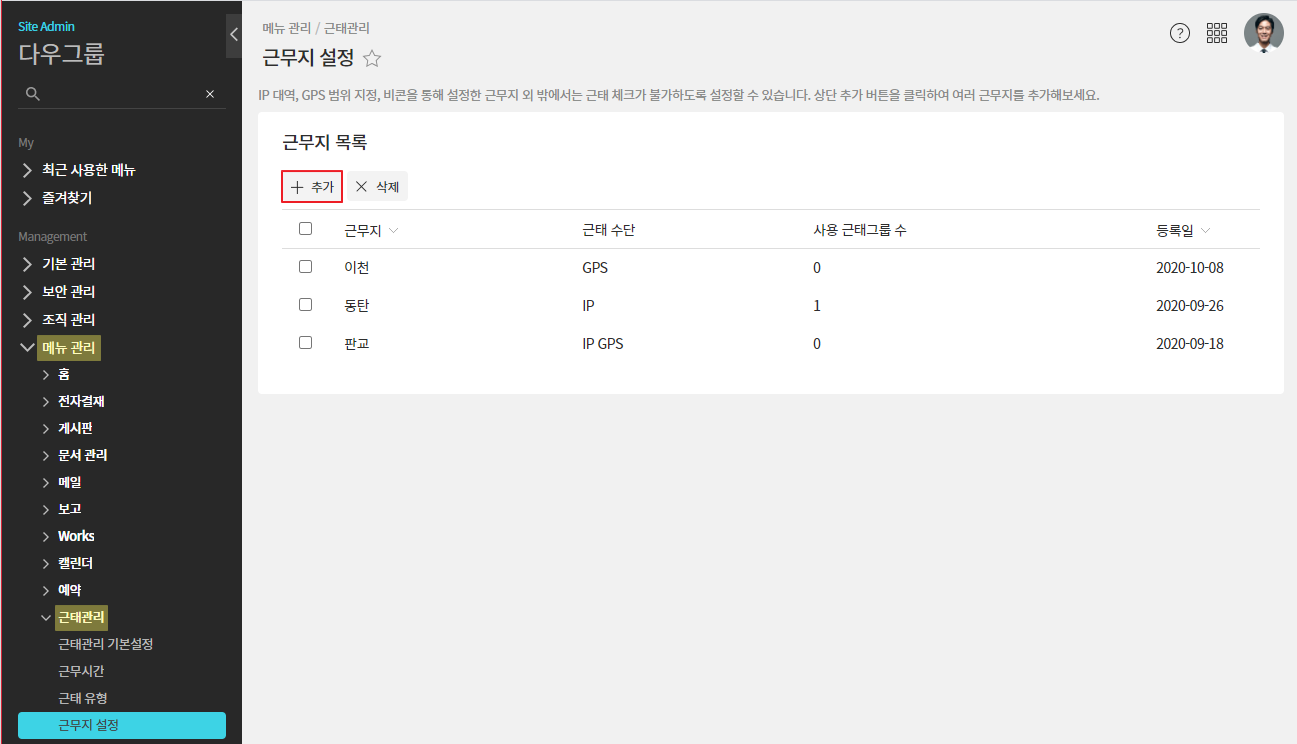 ① 관리자페이지(SiteAdmin) ▶ 메뉴 관리 ▶ 근태관리 ▶ 근무지 설정 ▶ + 추가