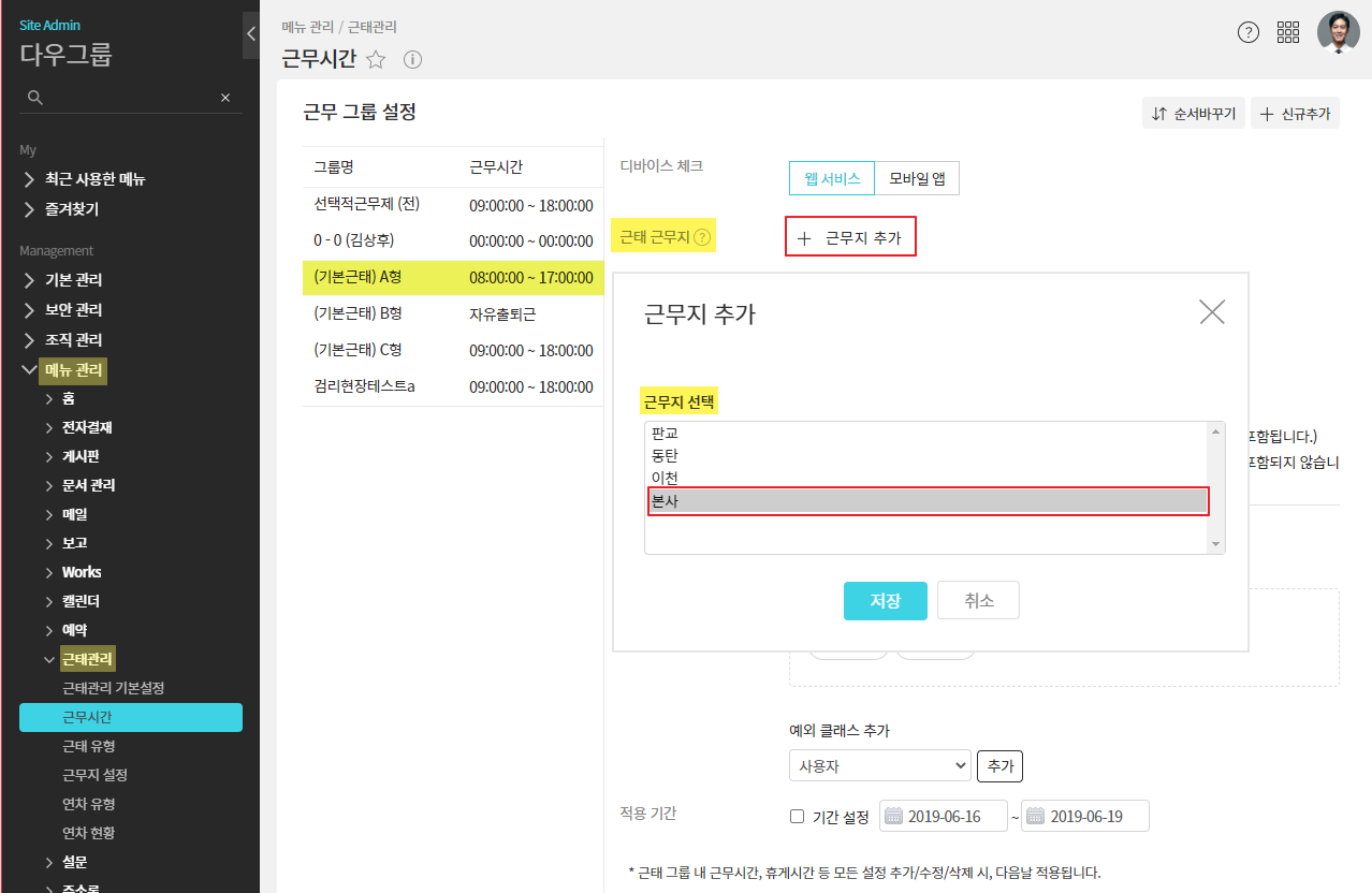 근태 근무지는 근무그룹별로 설정할 수 있습니다