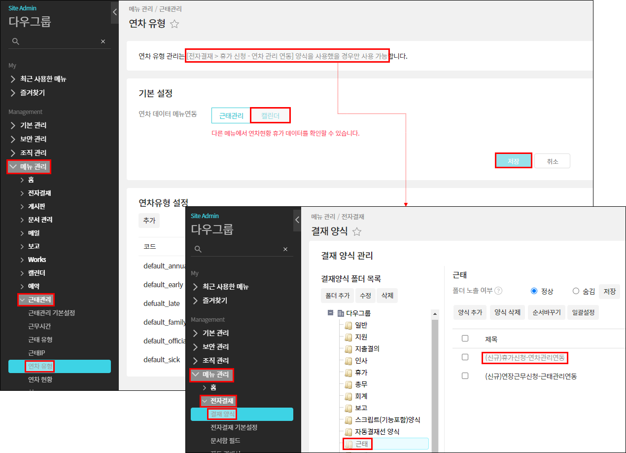 ① 관리자페이지(SiteAdmin) ▶ 메뉴관리 ▶ 근태관리 ▶ 연차 유형 ▷ 연차 데이터 메뉴연동 ▷ 캘린더 ▷ 저장
