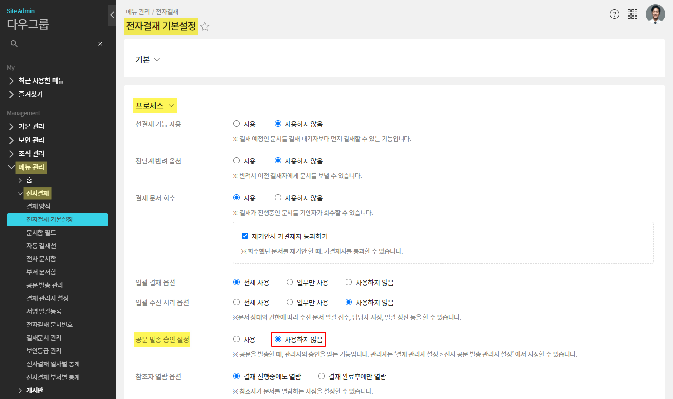 관리자 권한으로 공문 발송 승인 설정을 해제할 수 있습니다.