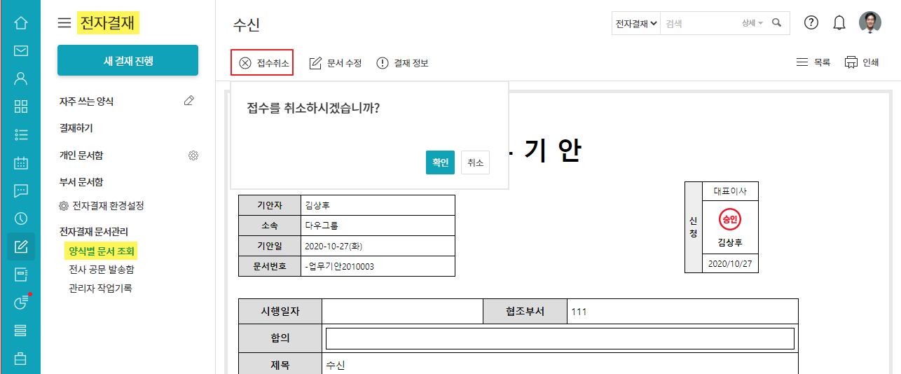 - 전자결재 ▶ 양식별 문서 조회 ▶ 문서 클릭 ▷ 접수취소 ▷ 확인