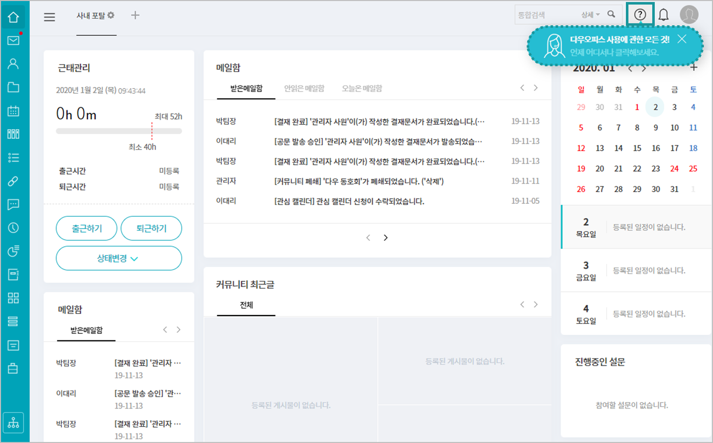 ① 그룹웨어 우측 상단의 물음표 클릭 ▷ 고객케어 라운지 클릭