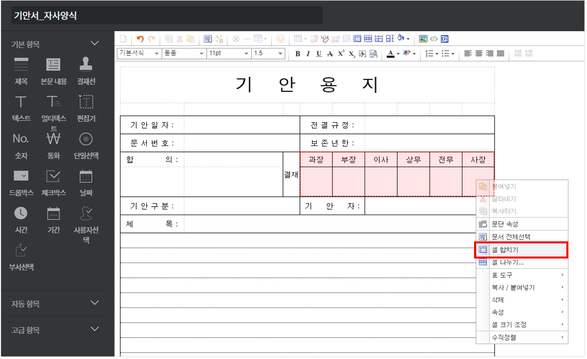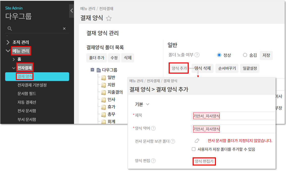 ② 관리자페이지 ▶ 메뉴 관리 ▶ 전자결재 ▶ 결재 양식 ▶ 폴더 선택 ▷ 양식 추가 ▷ 양식 명 및 양식 약어 입력 ▷ 양식 편집기
