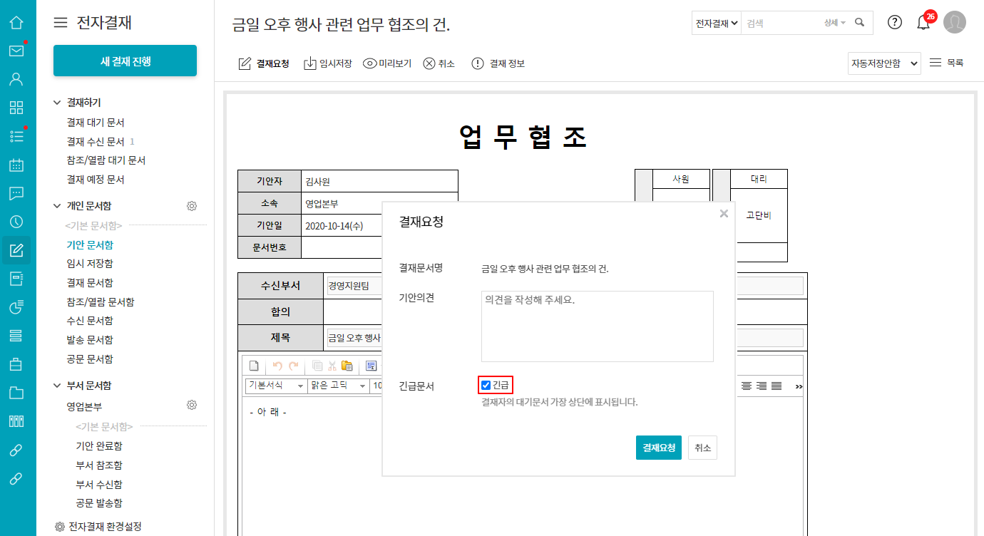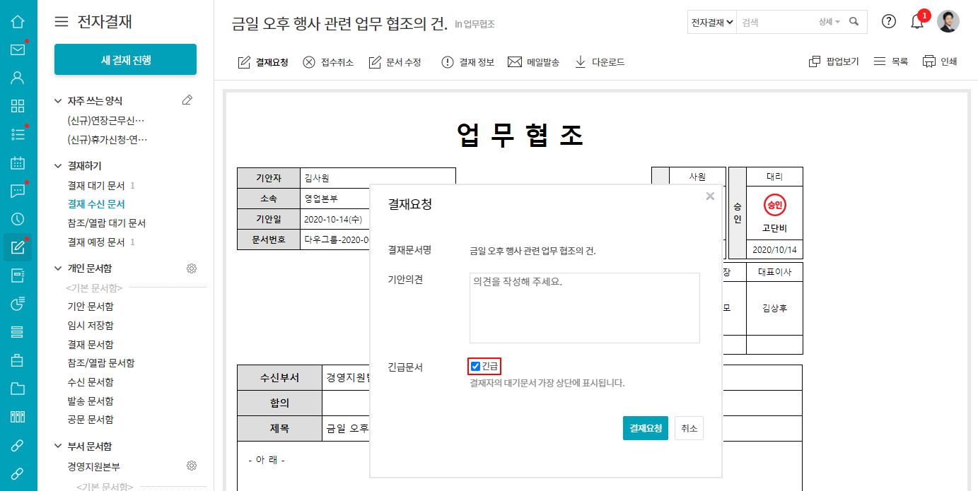 원본 문서가 긴급 문서로 진행된 건에 한해서만 수신 문서도 긴급으로 진행할 수 있습니다.