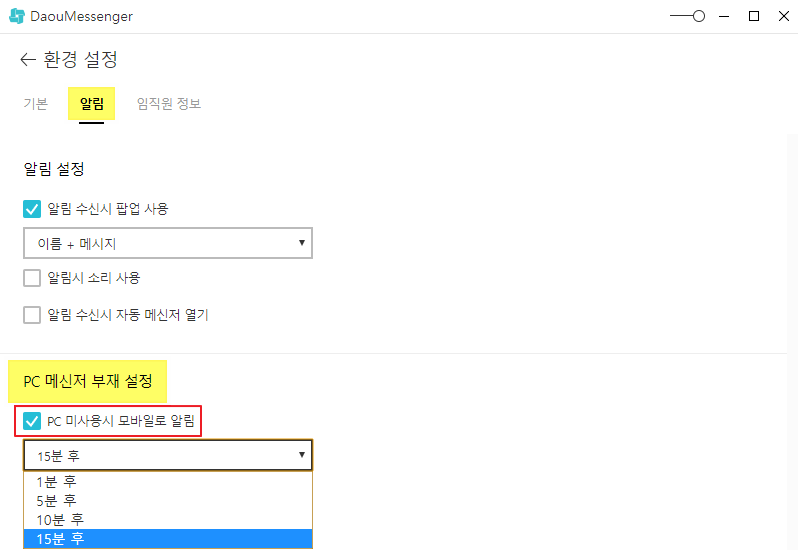 - 설정한 시간만큼 PC사용이 없을 경우 모바일로 메신저 대화 알림이 전환됩니다.