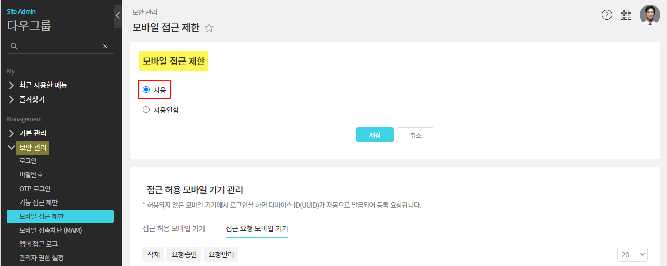 - 관리자 권한으로 [모바일 접근 제한]에서 사용자가 허용 요청한 기기를 승인할 수 있습니다.
