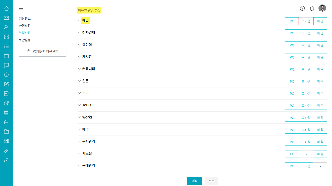 ② 메뉴별 알림 설정 ▷ 메일 ▷ 모바일 비활성화 ▷ 저장