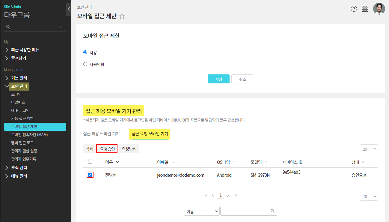 관리자 권한으로 [모바일 접근 제한]에서 사용자가 허용 요청한 기기를 승인할 수 있습니다.