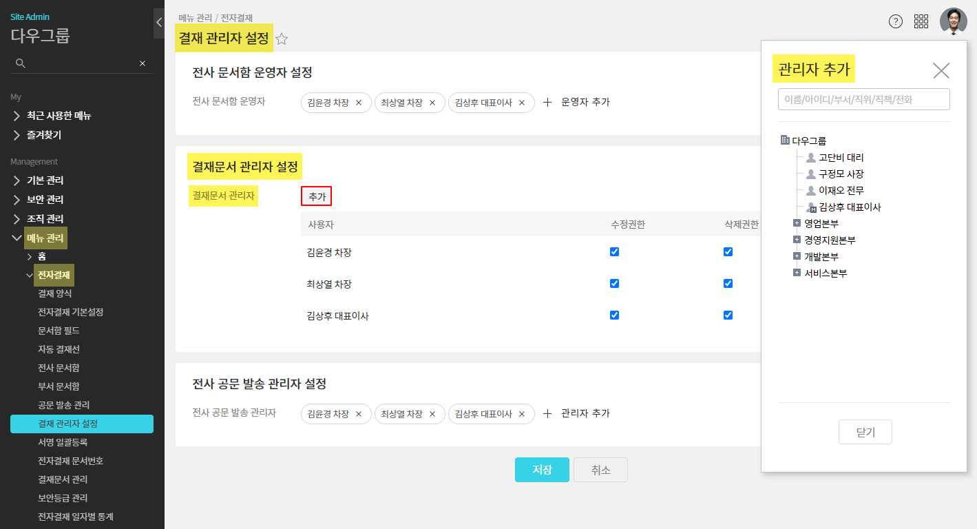 - 관리자페이지 ▶ 메뉴 관리 ▶ 전자결재 ▶ 결재관리자 설정 ▶ 결재문서 관리자 설정