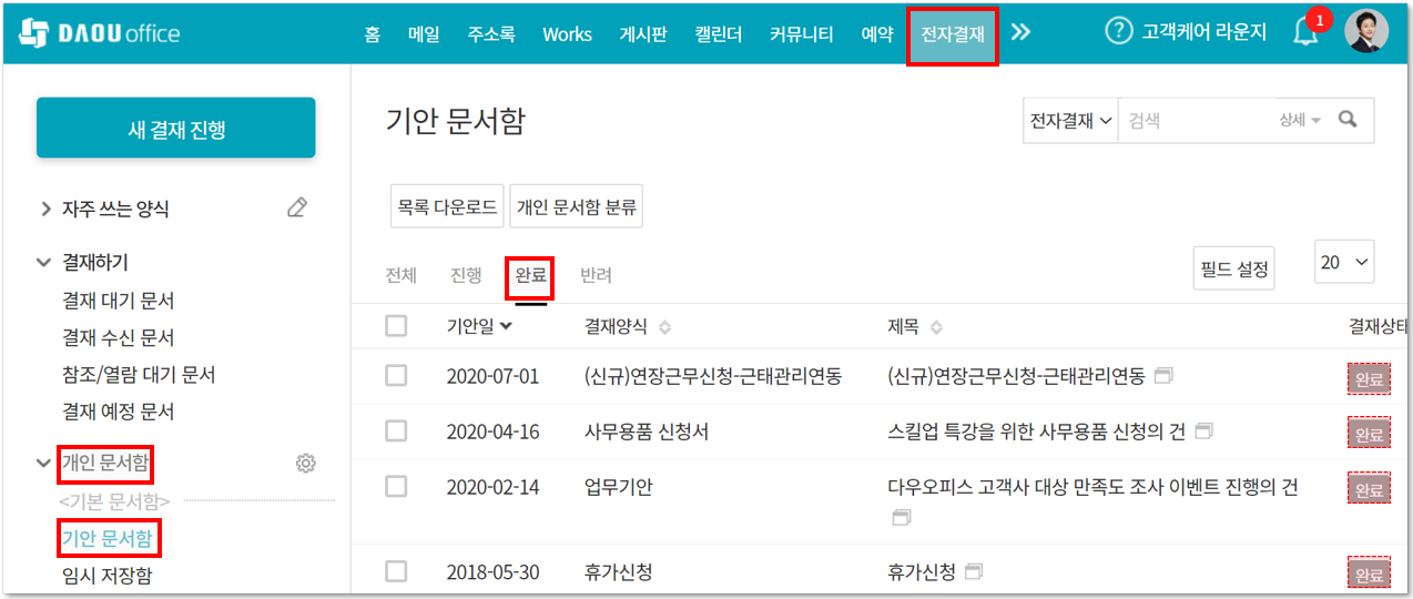 ② 개인 문서함 ▶ 기안 문서함 ▶ 완료 탭