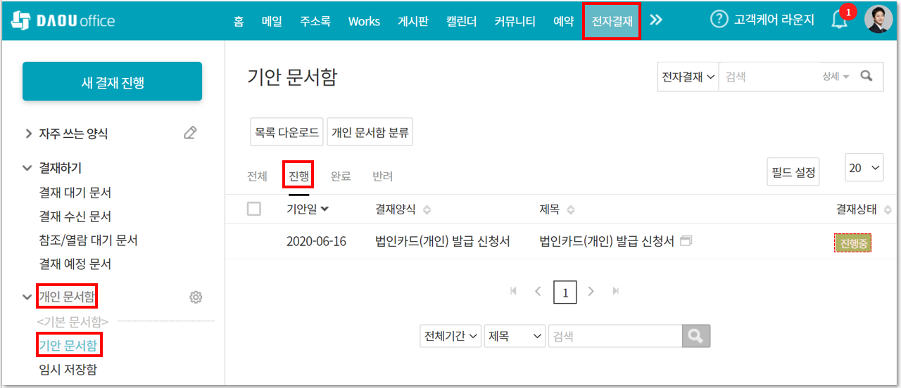 기안 문서함의 진행, 완료 탭에서 구분하여 확인할 수 있습니다.