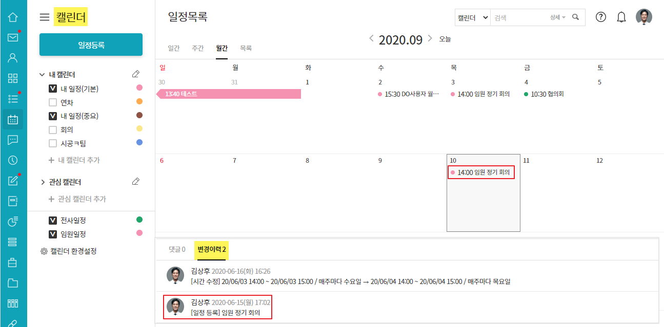 일정의 변경이력에서 등록자를 확인할 수 있습니다.