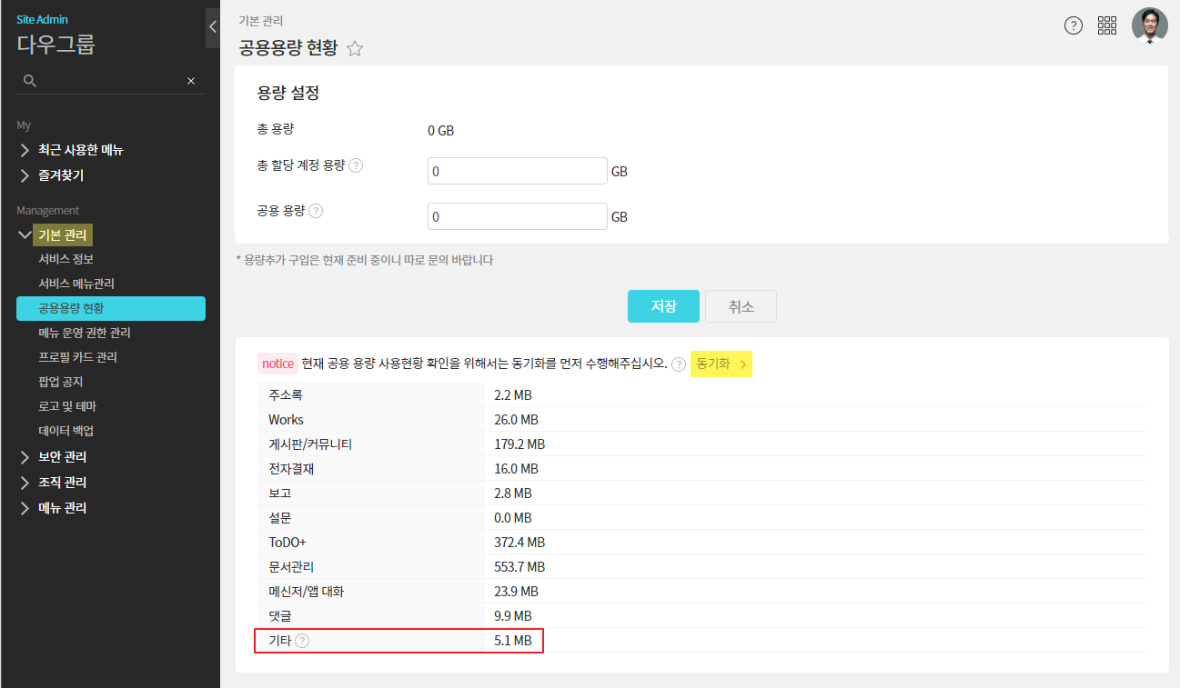 - 관리자페이지(SiteAdmin) ▶ 기본 관리 ▶ 공용용량 현황 ▶ 동기화 ▷ 기타 확인
