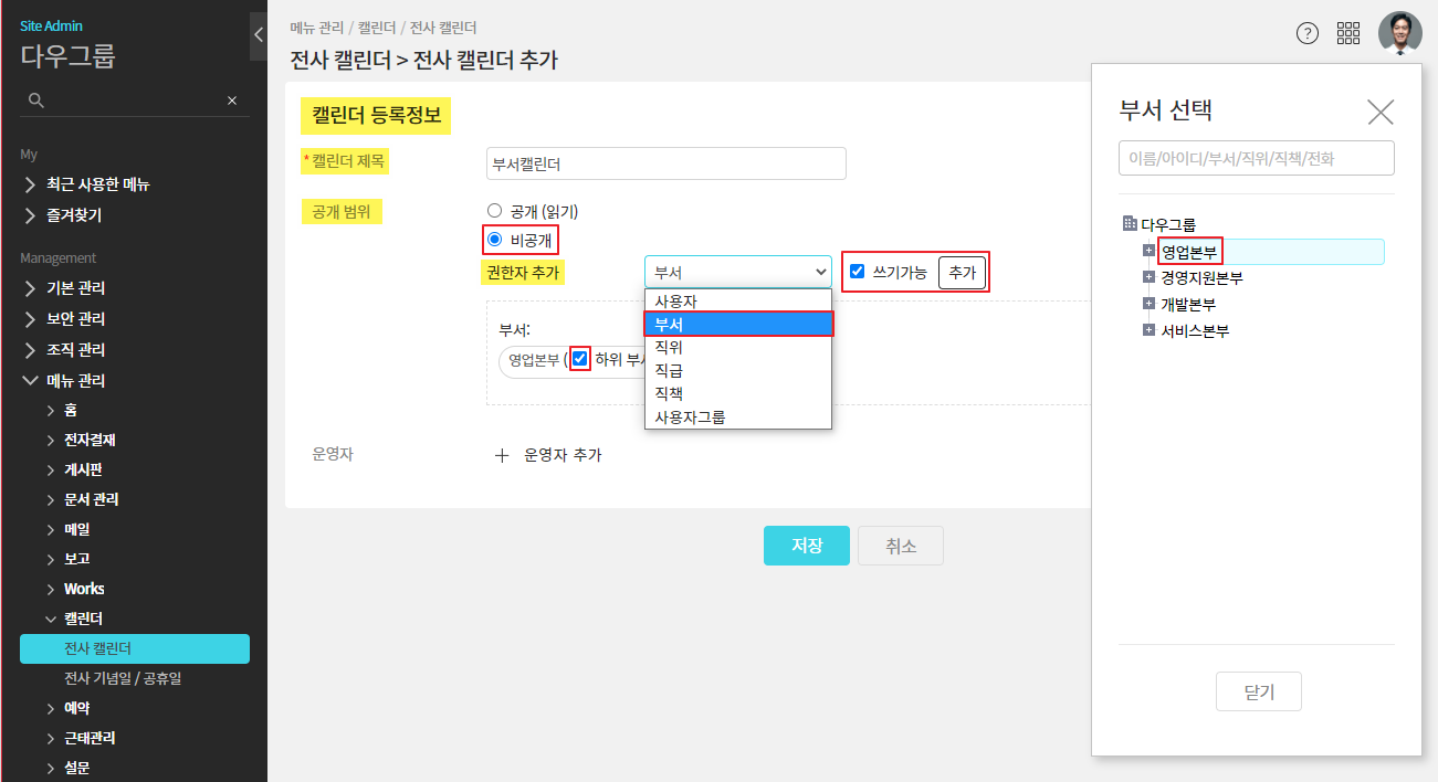 전사 캘린더의 비공개 기능을 활용하여 부서 캘린더를 추가할 수 있습니다.