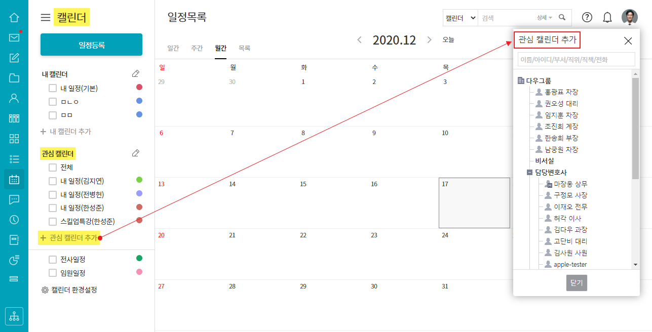 상대방의 캘린더가 공개로 설정되어있을 경우 조직도의 일정보기 및 관심캘린더 추가를 통해 일정 공유가 가능합니다.