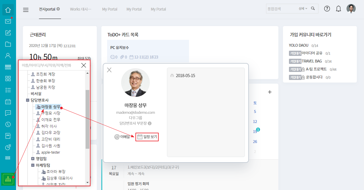 조직도 ▷ 사용자 검색 또는 클릭 ▷ 프로필 내의 일정보기 클릭
