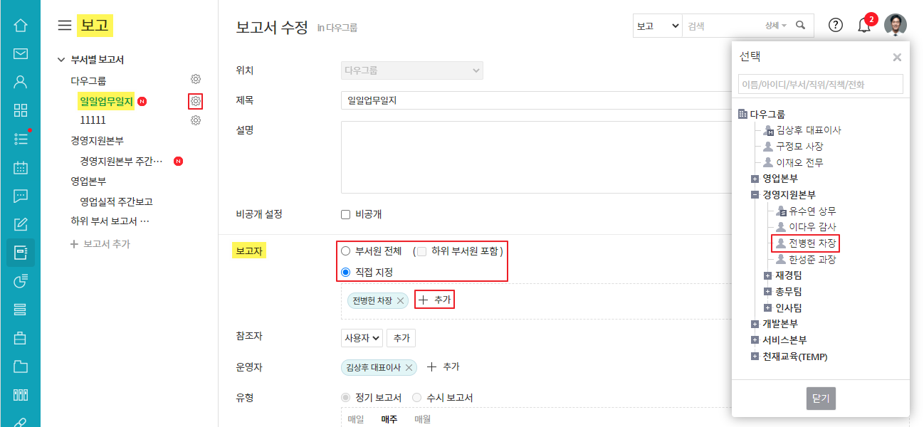 보고서의 운영자, 부서장, 부부서장이 보고자를 설정할 수 있습니다.