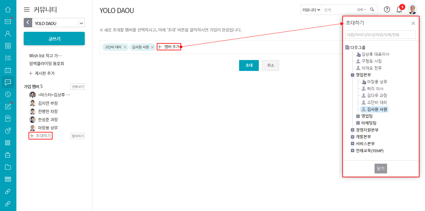 - + 초대하기 ▷ + 멤버 추가 ▷ 조직도에서 초대할 사용자 선택 ▷ 초대