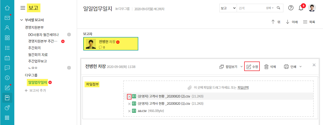 - 보고 ▶ 보고서 ▶ 보고 클릭 ▷ 수정 ▷ 파일첨부 ▷ 파일 옆 X 클릭하여 삭제 ▷ 등록