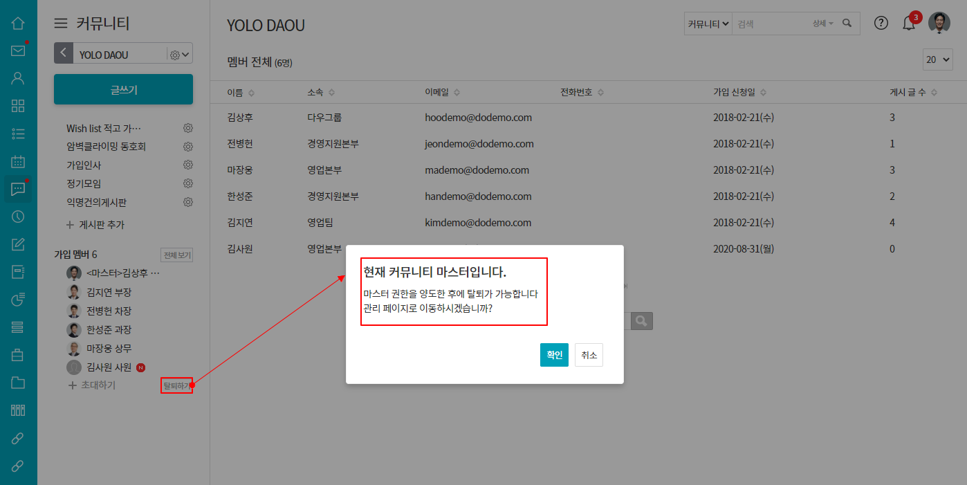 ■ 요약 다른 멤버에게 마스터 권한이 양도됩니다. 마스터가 커뮤니티를 탈퇴하려면 마스터 권한을 다른 멤버에게 양도한 후에 탈퇴가 가능합니다.