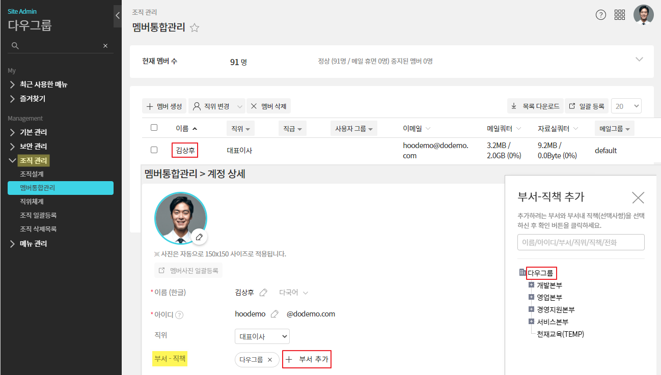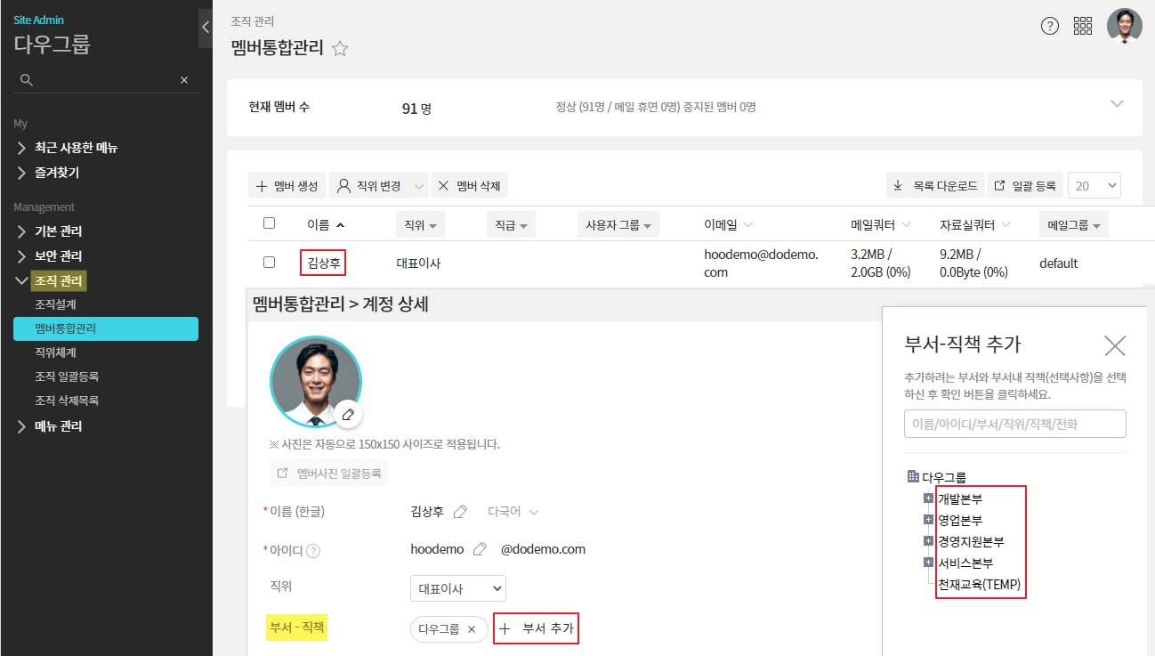① 관리자페이지(SiteAdmin) ▶ 조직 관리 ▶ 멤버통합관리 ▶ 사용자 클릭 ▷