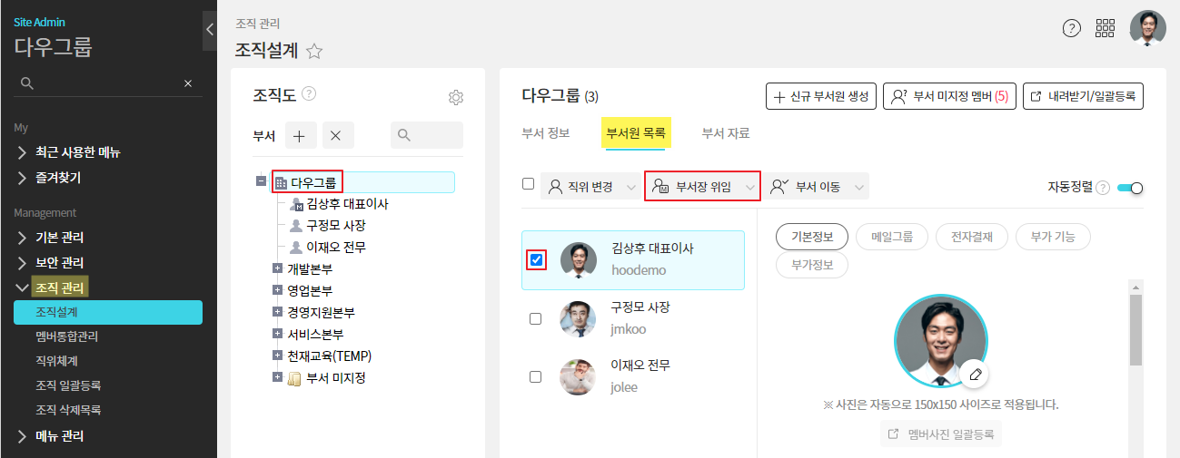 부서원 목록 ▷ 사용자 체크 ▷ 부서장 위임