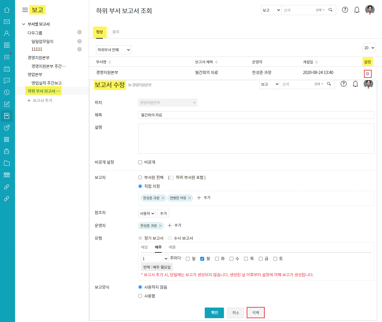<최상위 부서의 부서장 설정 후 [하위 보고서 조회]로 보고서 삭제 방법>