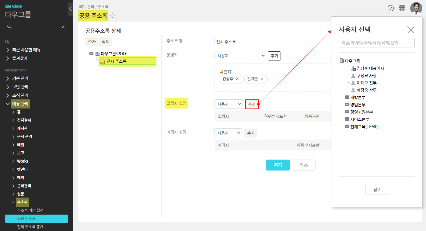 - 관리자페이지(SiteAdmin) ▶ 메뉴 관리 ▶ 주소록 ▶ 공용 주소록 ▶ 주소록 선택 ▷ 열람자 설정 ▷ 추가