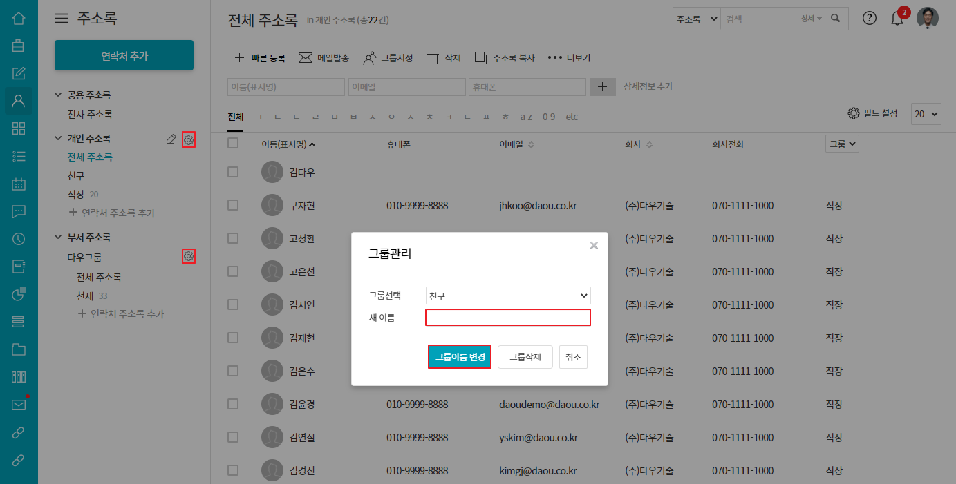 - 개인 주소록/부서 주소록 우측의 톱니바퀴 아이콘 클릭 ▶ 새 이름 입력 ▷ 그룹이름 변경