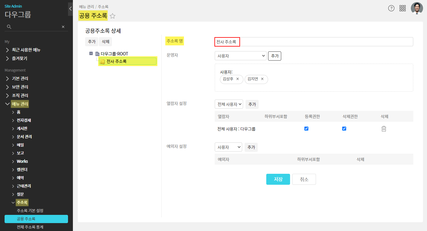 - 관리자페이지(SiteAdmin) ▶ 메뉴 관리 ▶ 주소록 ▶ 공용 주소록 ▶ 주소록 선택 ▷ 주소록 명 ▷ 새 주소록 명 입력 ▷ 저장