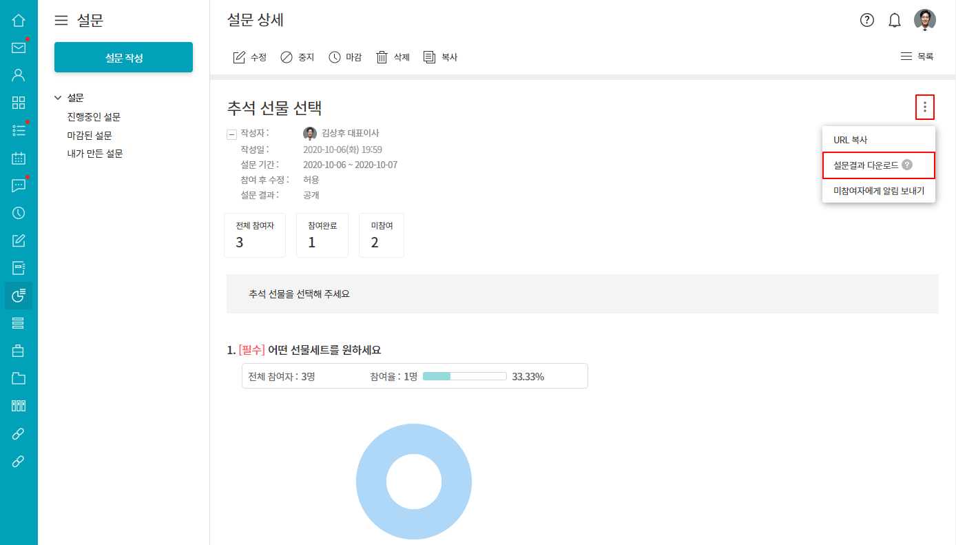 ② 우측 점 세개 버튼 클릭 ▷ 설문 결과 다운로드