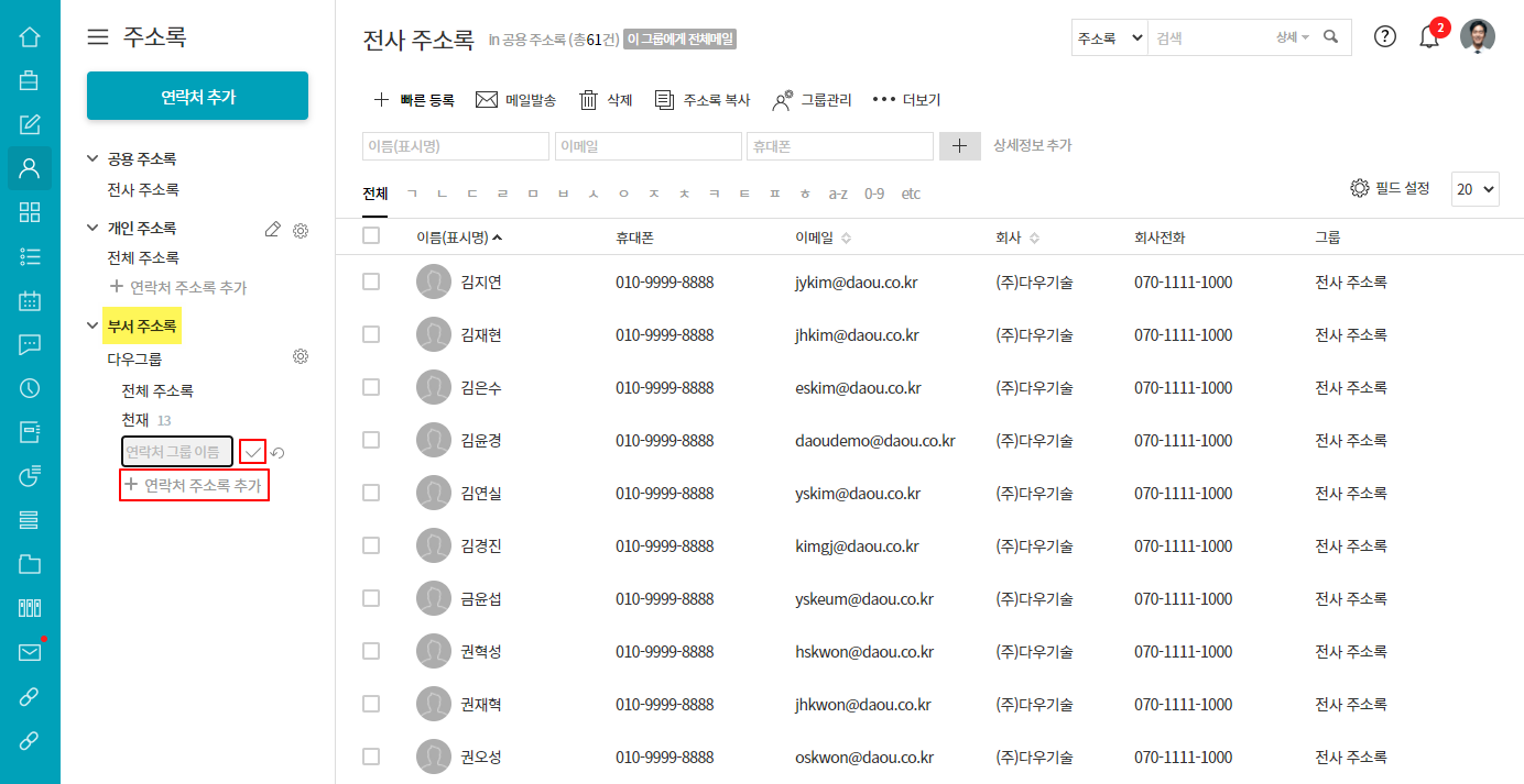 부서원이라면 부서 주소록 내에서 자유롭게 연락처 그룹을 추가할 수 있으며, 주소록을 만들거나 삭제할 수 있습니다.