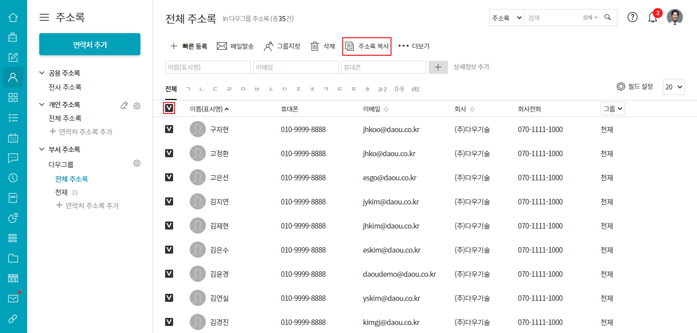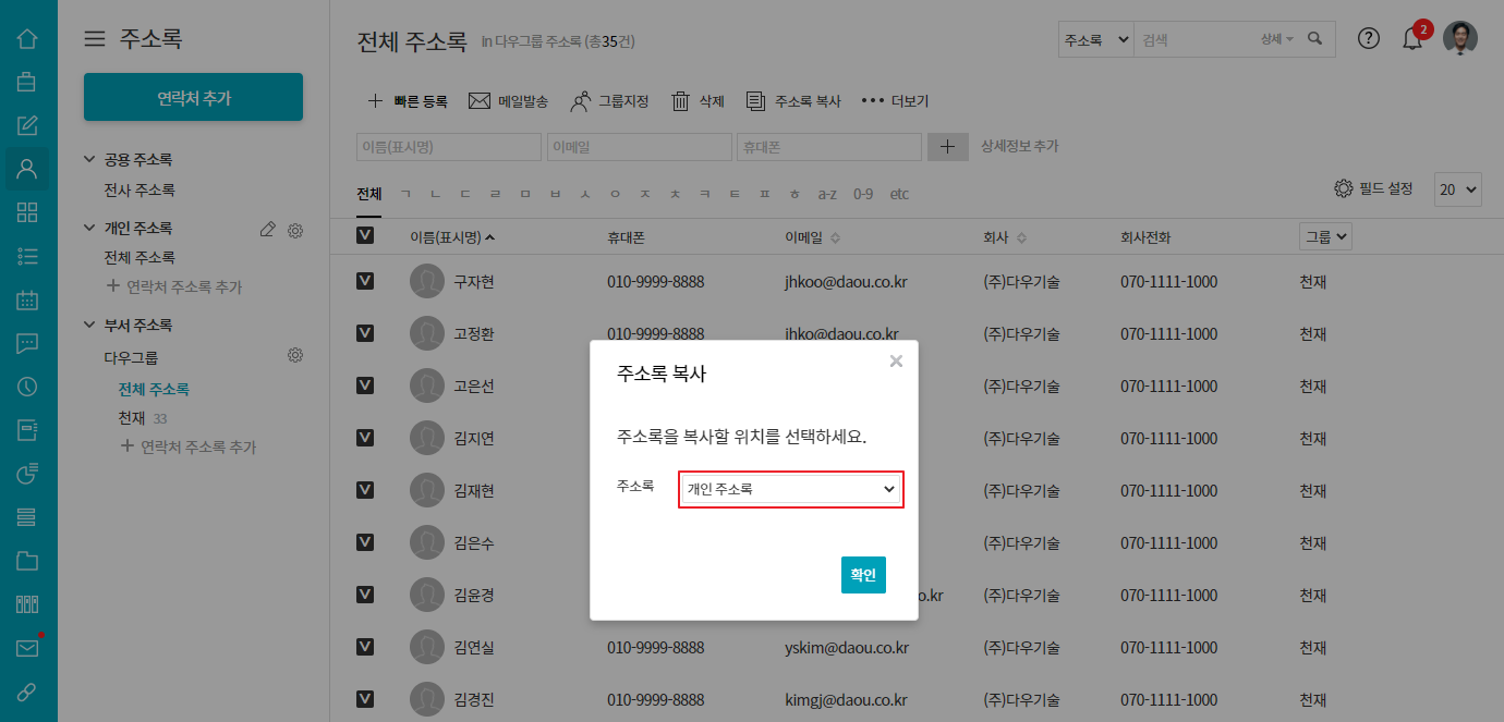 또한 부서 주소록 내 주소록 목록을 개인 주소록으로 복사하거나, 반대로 개인 주소록을 부서 주소록으로 복사할 수 있습니다.