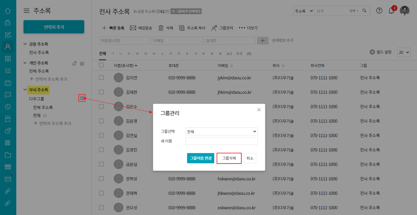 - 주소록 ▶ 부서 주소록 ▶ 톱니바퀴 아이콘 클릭 ▷ 그룹 선택 ▷ 그룹 삭제 ▷ 삭제