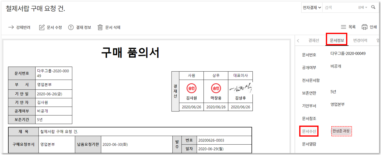 수신자가 해당 결재문서를 반송하면 연결된 결재문서를 삭제할 수 있습니다.