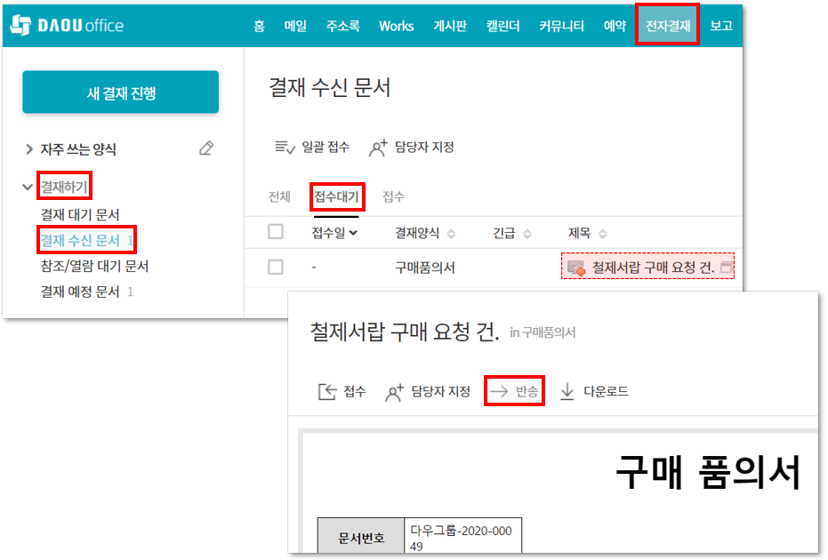 ① 접수 전 : 결재하기 ▶ 결재 수신 문서 ▶ 접수대기 ▷ 문서 선택 ▷ 반송