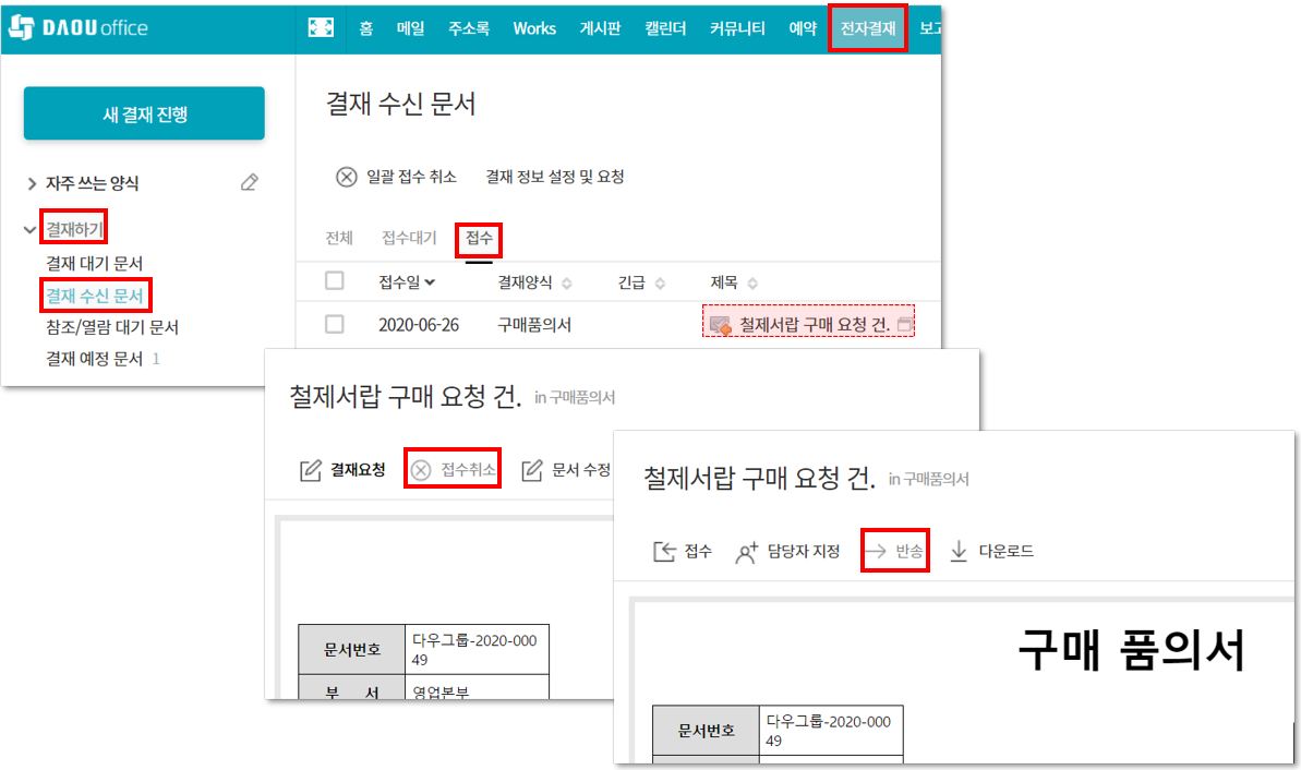 ② 접수 후 : 결재하기 ▶ 결재 수신 문서 ▶ 접수 ▷ 문서 선택 ▷ 접수 취소 ▷ 반송