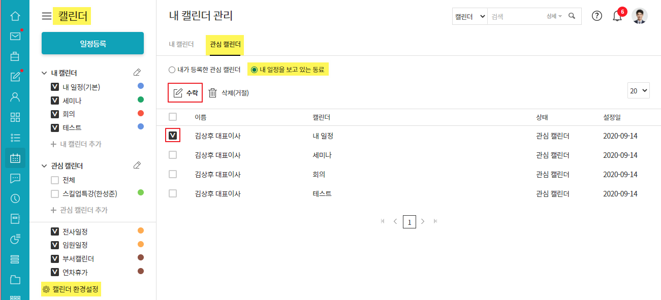 - 캘린더 ▶ 캘린더 환경설정 ▷ 관심 캘린더 ▷ 내 일정을 보고 있는 동료 ▷ 신청 체크 ▷ 수락