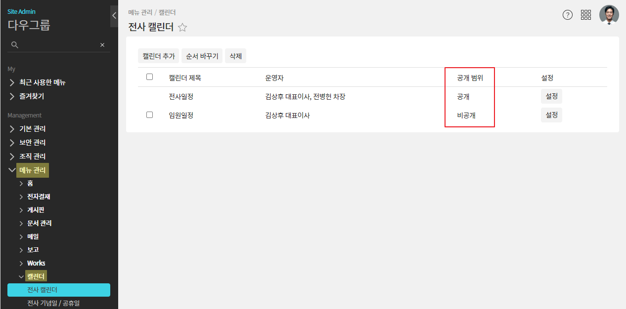 - 관리자페이지(SiteAdmin) ▶ 메뉴 관리 ▶ 캘린더 ▶ 전사 캘린더 ▶ 공개 범위 확인
